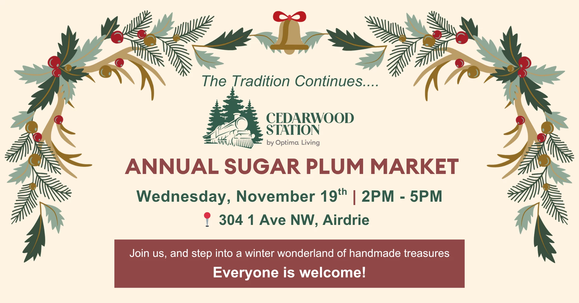 The tradition continues at Cedarwood Station’s Annual Sugar Plum Market! Join us and step into a winter wonderland of handmade treasures, festive treats, and local creations. Bring your holiday spirit, shop from local vendors, and celebrate the magic of the season with us.